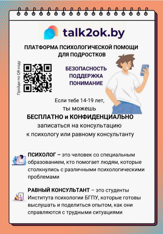 ЮНИСЕФ в Беларуси вместе с экспертами Республиканского центра психологической помощи БГПУ запустили онлайн-платформу talk2ok.by, с помощью которой подростки и молодые люди могут бесплатно и конфиденциально получать квалифицированную психологическую помощь.