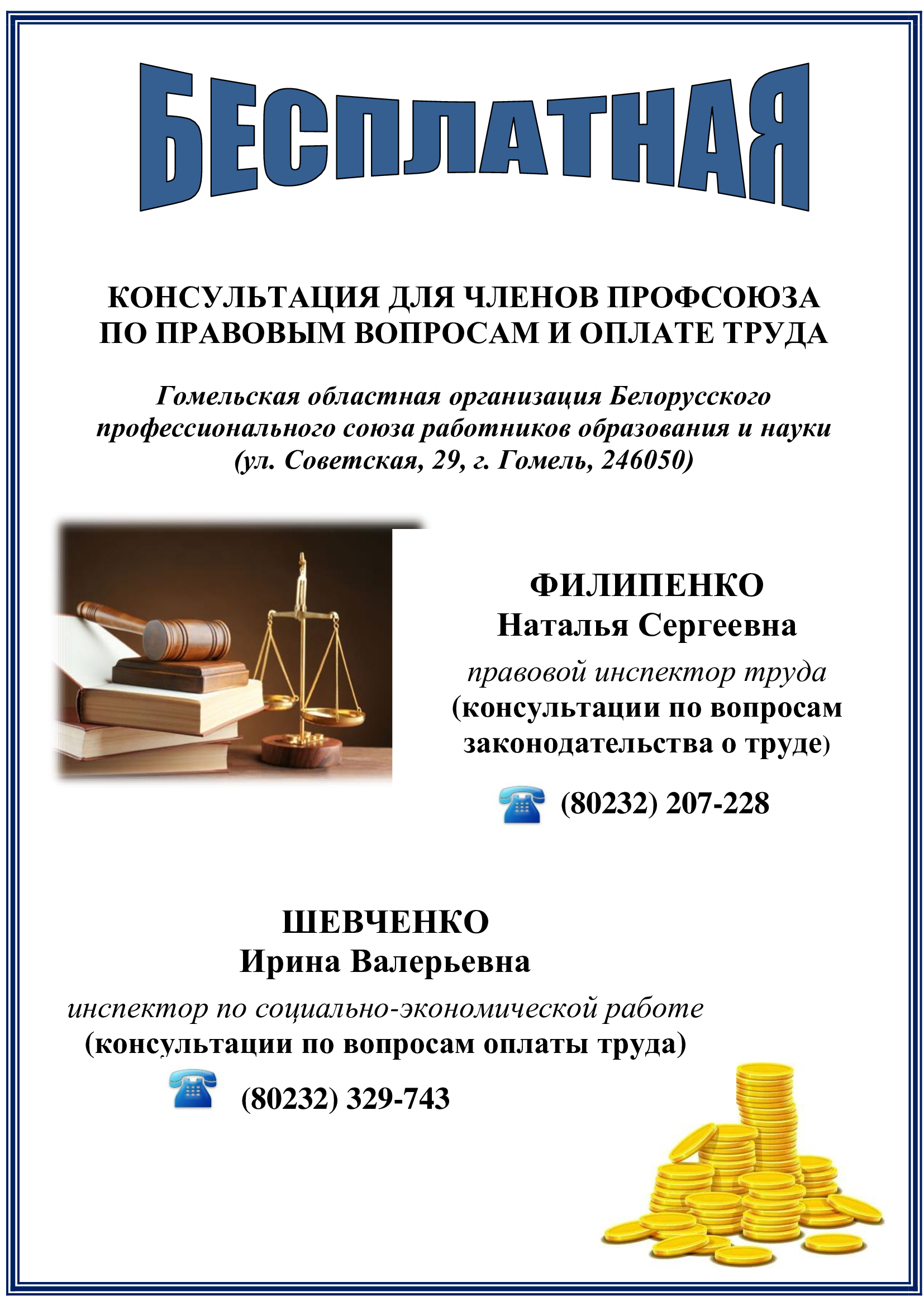 - Консультация для членов профсоюза по правовым вопросам и оплате труда