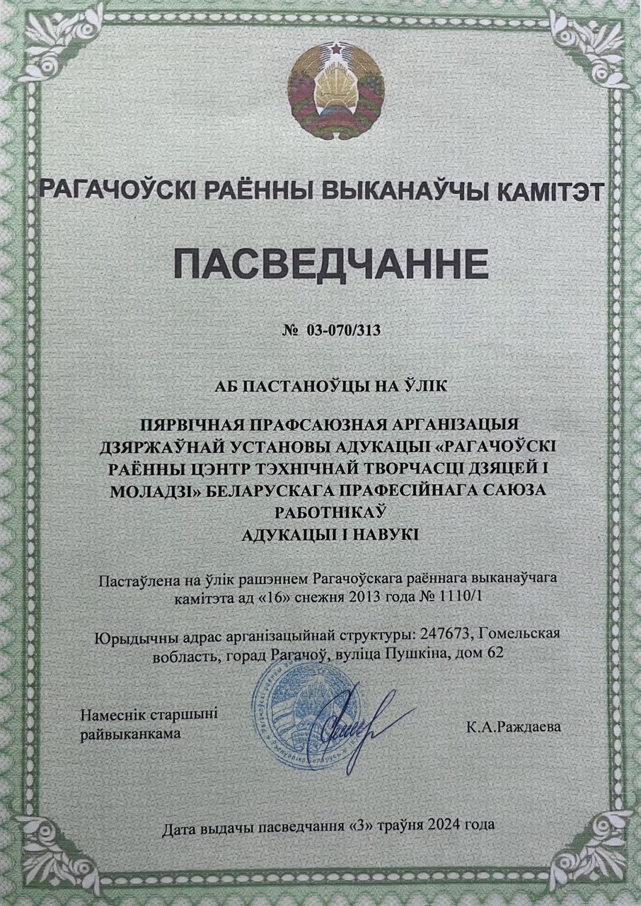 - Свидетельство о регистрации первичной профсоюзной организации государственного учреждения образования «Рогачевский районный центр технического творчества детей и молодежи»